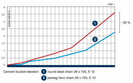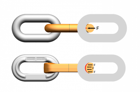 - La geometría específica de carga de la cadena pewag hero tiene mayor área de contacto entre eslabones y más del doble del volumen de desgaste que una cadena convencional. Con ello se reduce significantemente el contacto y la tensión máxima y se aumenta el rendimiento y la vida útil en un 30% aproximadamente.